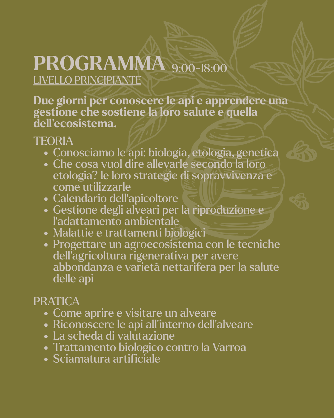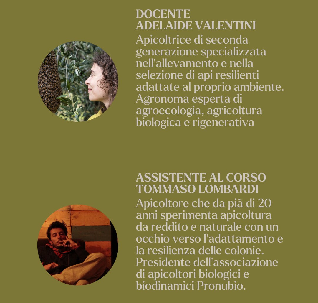 Sarà un corso base, adatto anche a chi parte da zero. Ma porteremo con noi uno sguardo sistemico, per iniziare fin da subito a leggere l’alveare come parte viva di un territorio più grande. E forse anche di una visione agricola diversa, in cui la rigenerazione non è un concetto, ma una pratica quotidiana.